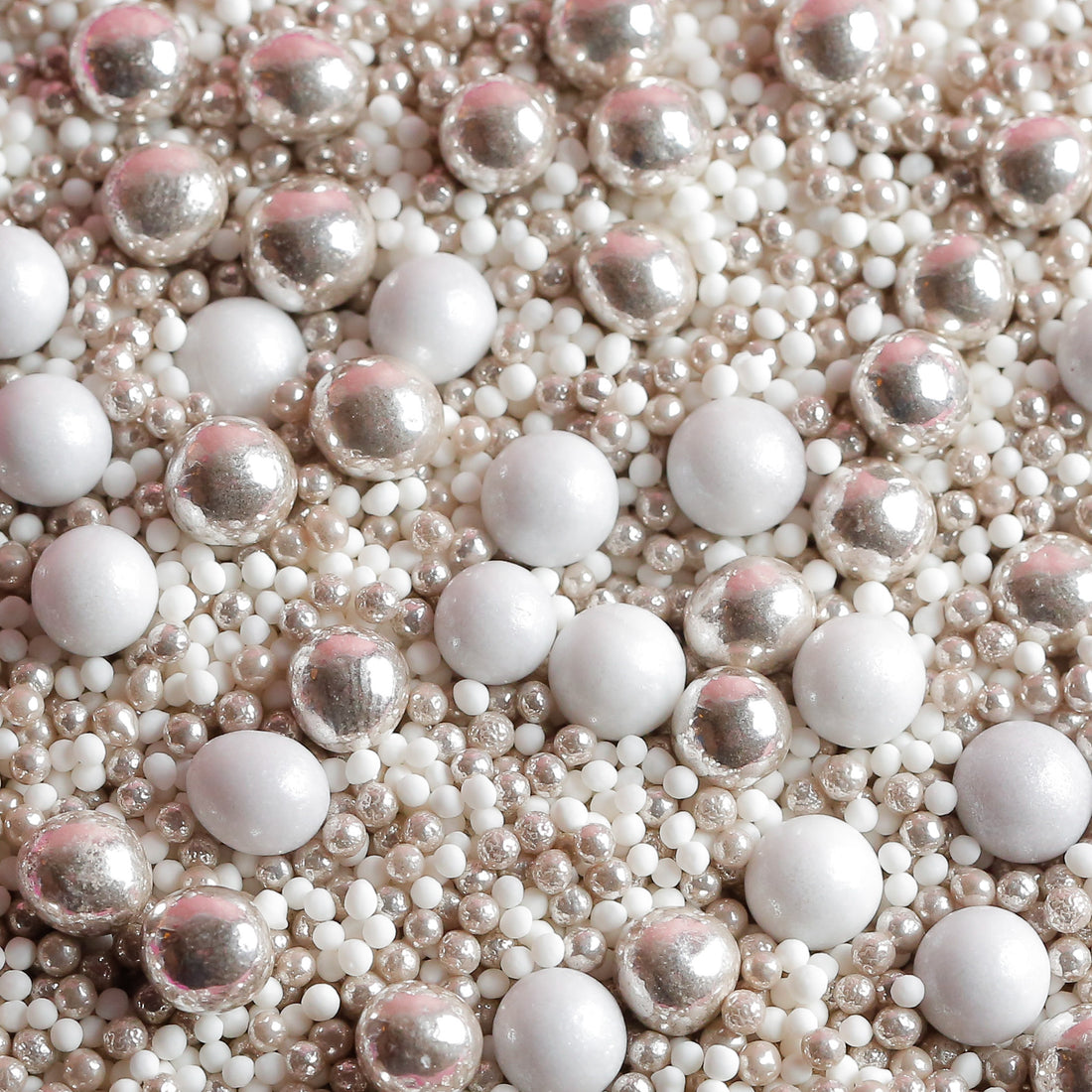 Large Pearls: Sugar, Milk chocolate [sugar, whole milk powder, cocoa butter, cocoa mass, emulsifier: soya lecithin, natural vanilla flavouring], Crispy cereal centre (rice flour, wheat flour, sugar, malted wheat flour, wheat gluten, salt), Stabilisers (Arabic gum, sucrose esters of fatty acids), Cocoa butter, Glazing agent (carnauba wax), wheat starch, Glucose syrup, Maize starch, Colours (E174 silver), Agar.