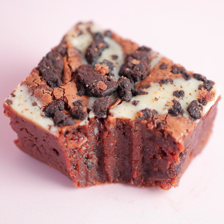 Ingredients: Salted butter (milk), 54% dark chocolate (sugar, cocoa butter, cocoa mass, emulsifier: soya lecithin, natural vanilla), Eggs, Granulated sugar, Light brown sugar, Wheat flour (gluten), 70% dark chocolate (sugar, fat-reduced cocoa powder, cocoa mass, emulsifier: soya lecithin, natural vanilla), Icing sugar, Cream cheese (milk), Oreo crumbs (wheat flour, sugar, palm oil, low fat cocoa powder, glucose-fructose syrup, raising agents: sodium bicarbonate and/or ammonium bicarbonate, soya lecithin, salt, whey powder (milk), chocolate, flavouring).