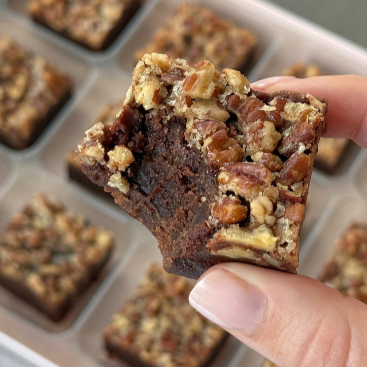 Please note: our products are made in an environment that handles nuts, gluten, and other allergens, so traces may be present. Brownies are finished with Belgian milk chocolate, and letters/icons are crafted from natural Belgian white chocolate. Gluten-free options are available.